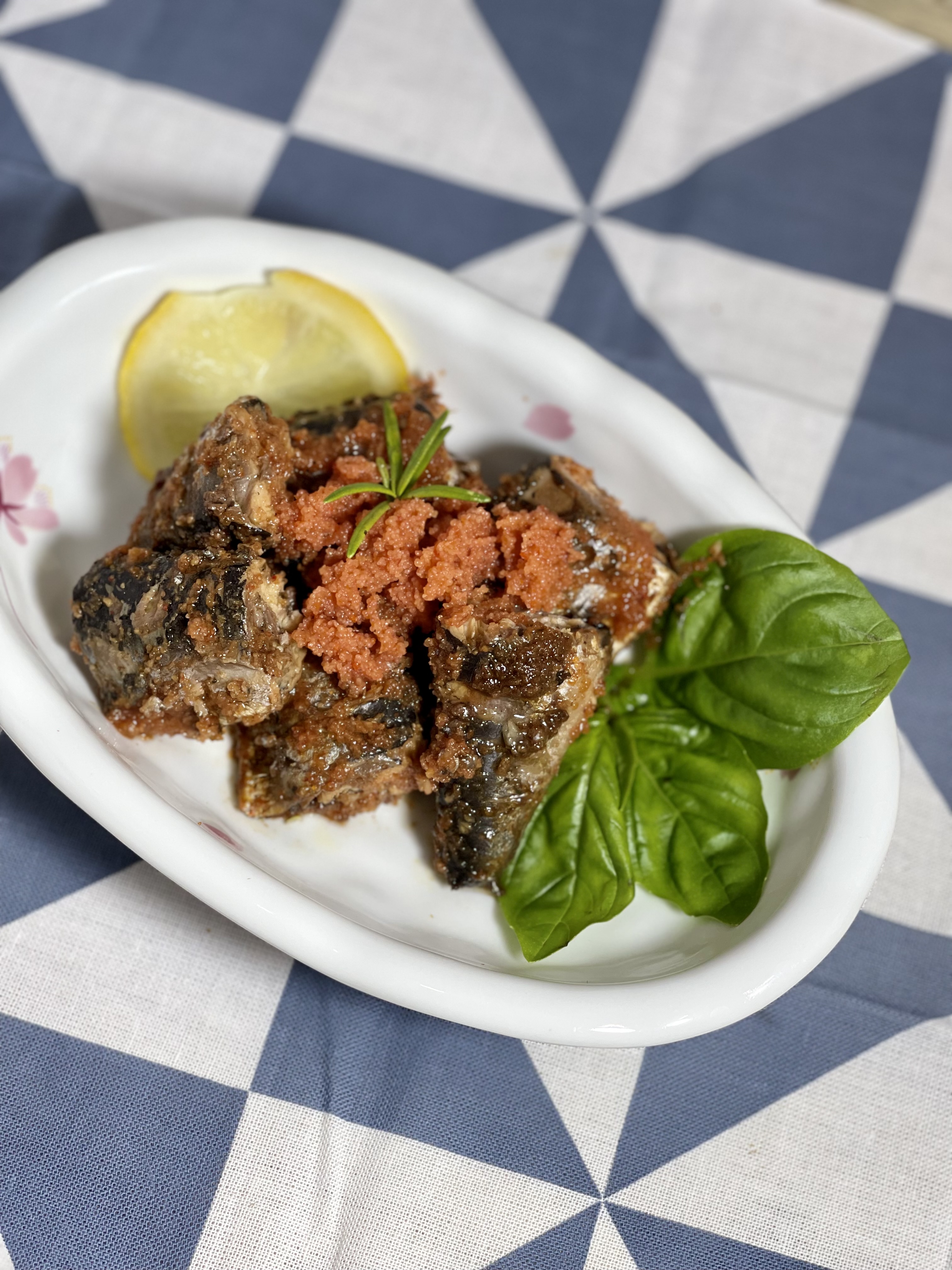 さば(ノルウェー産)・辛子明太子・米ぬか・醤油・砂糖・米黒酢・生姜・食塩・山椒・赤唐辛子/調味料(アミノ酸等)・甘味料(ソルビット)・酸化防止剤(V.C)・着色料(赤102・黄5・赤3)・発色剤(亜硝酸Na)(一部に小麦・大豆・さばを含む)